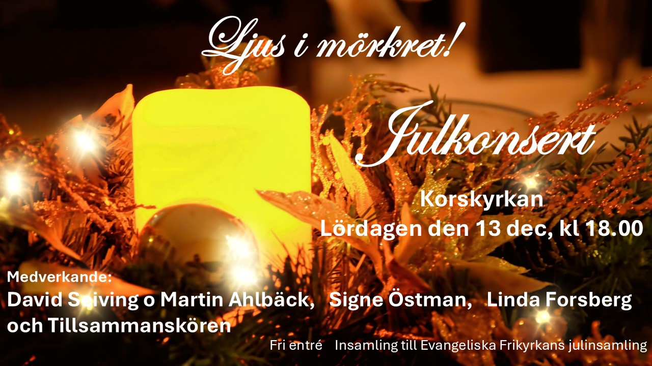 Tillsammanskören bjuder in till en av årets höjdpunkter i Korskyrkan - julkonsert tillsammans med en rad talangfulla gäster: David Seiving & Martin Ahlbäck, Signe Östman samt Linda Forsberg. Skriv upp den 13 december kl 18:00 och bjud med dina vänner.……